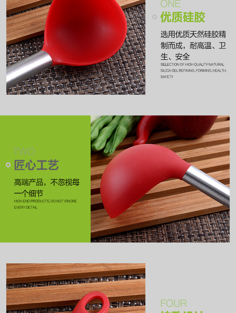 1、這件硅膠廚具完美的適用于家庭廚房,安全環(huán)保耐用,很好的保護(hù)了不粘鍋的涂層,減少摩擦,也打破廚房用品顏色單一選擇,讓廚房時光更加美好